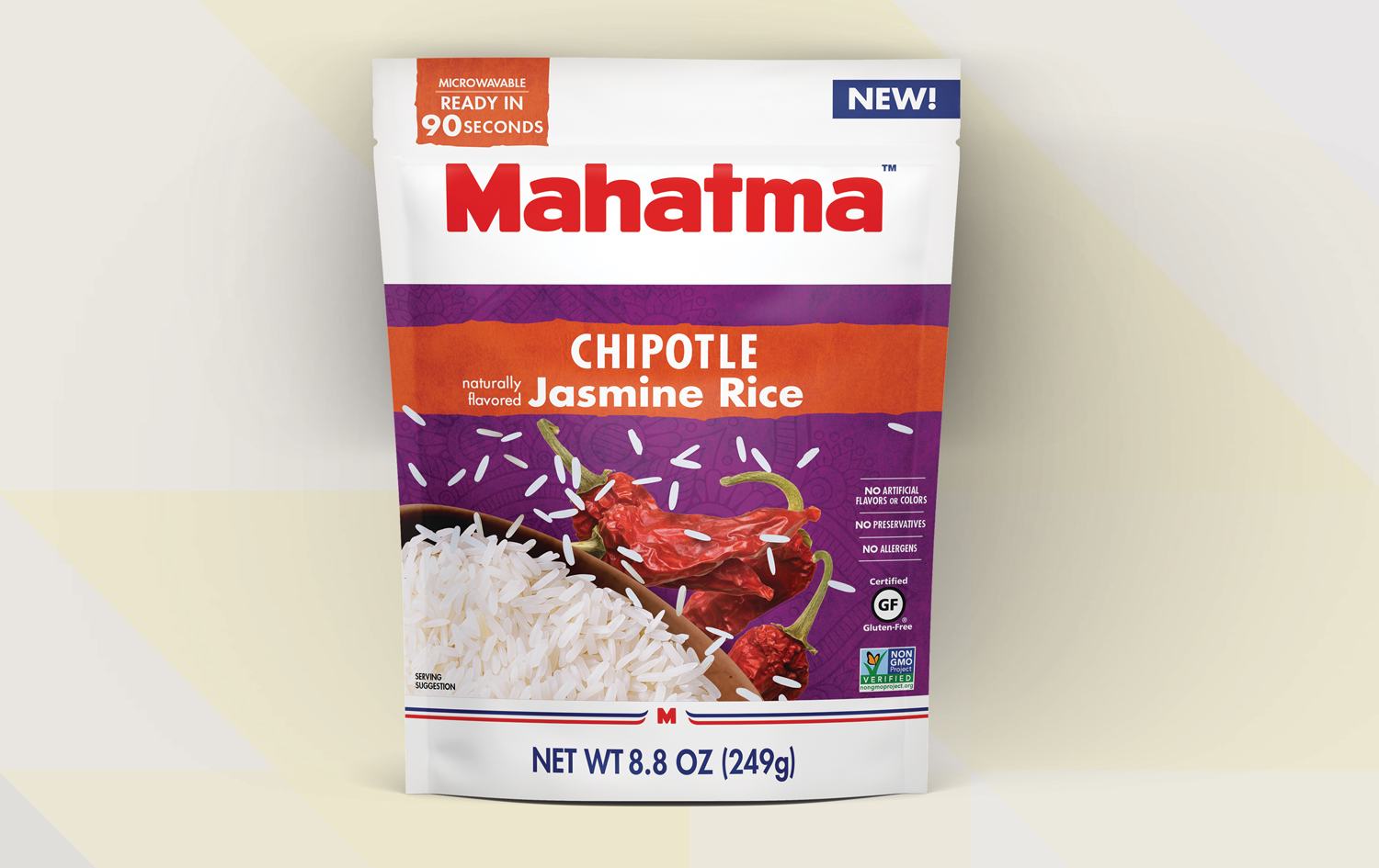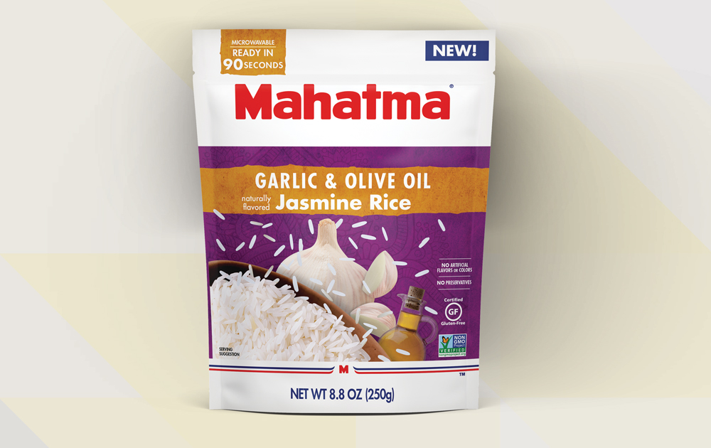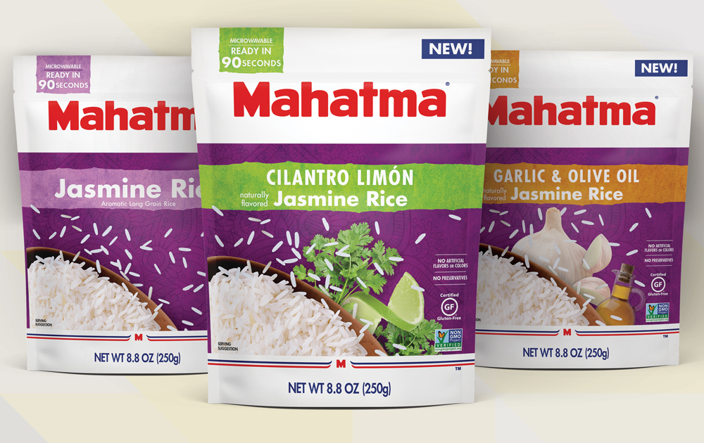Mahatma Ready in 90 Seconds Jasmine Rice flavors Graphic Design Package Design Brand Development Color Palette SKU development 3D renderings I was responsible for concepting and creating a visual story from the ground up to illustrate Mahatma’s new line of Jasmine Rice. I created the pack architecture, color palette, product shot, flavor que’s and later created the mechanical files for production. Mahatma started the lineup with Jasmine Rice, Cilantro Limón naturally flavored Jasmine Rice and Garlic and Olive Oil naturally flavored Jasmine Rice and they were very happy with these designs they came back and asked for additional flavors. Back to all work © Heather Craft • 2020